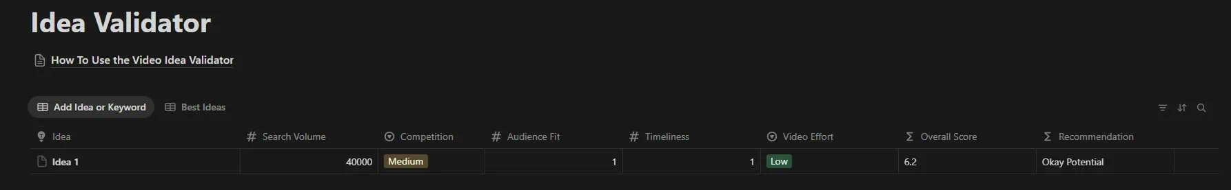 Each video comes with its own dedicated workspace. It starts with defining your audience and research, then making titles, next thumbnails, after that scripting, and lastly a video descrption and a publishing checklist.